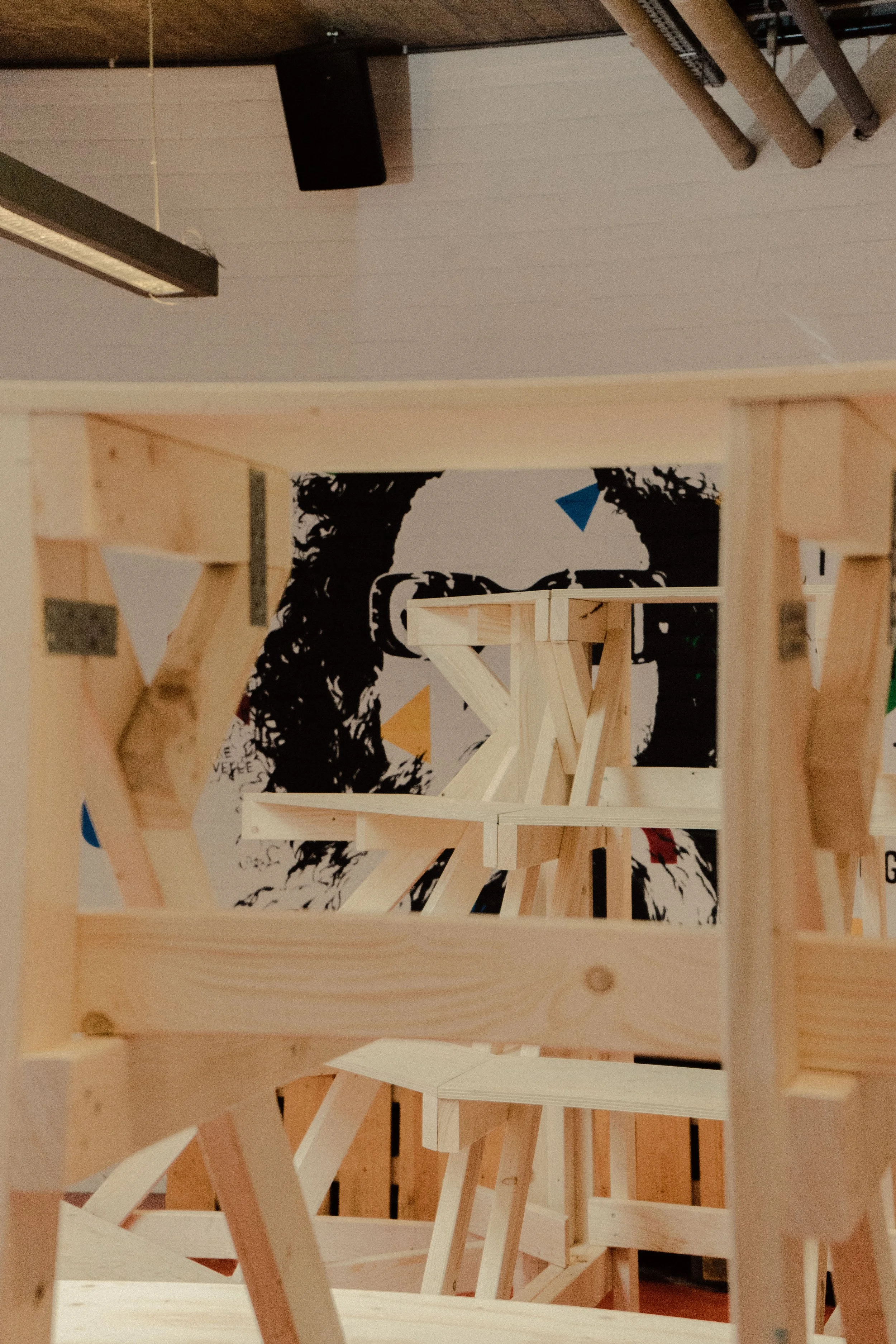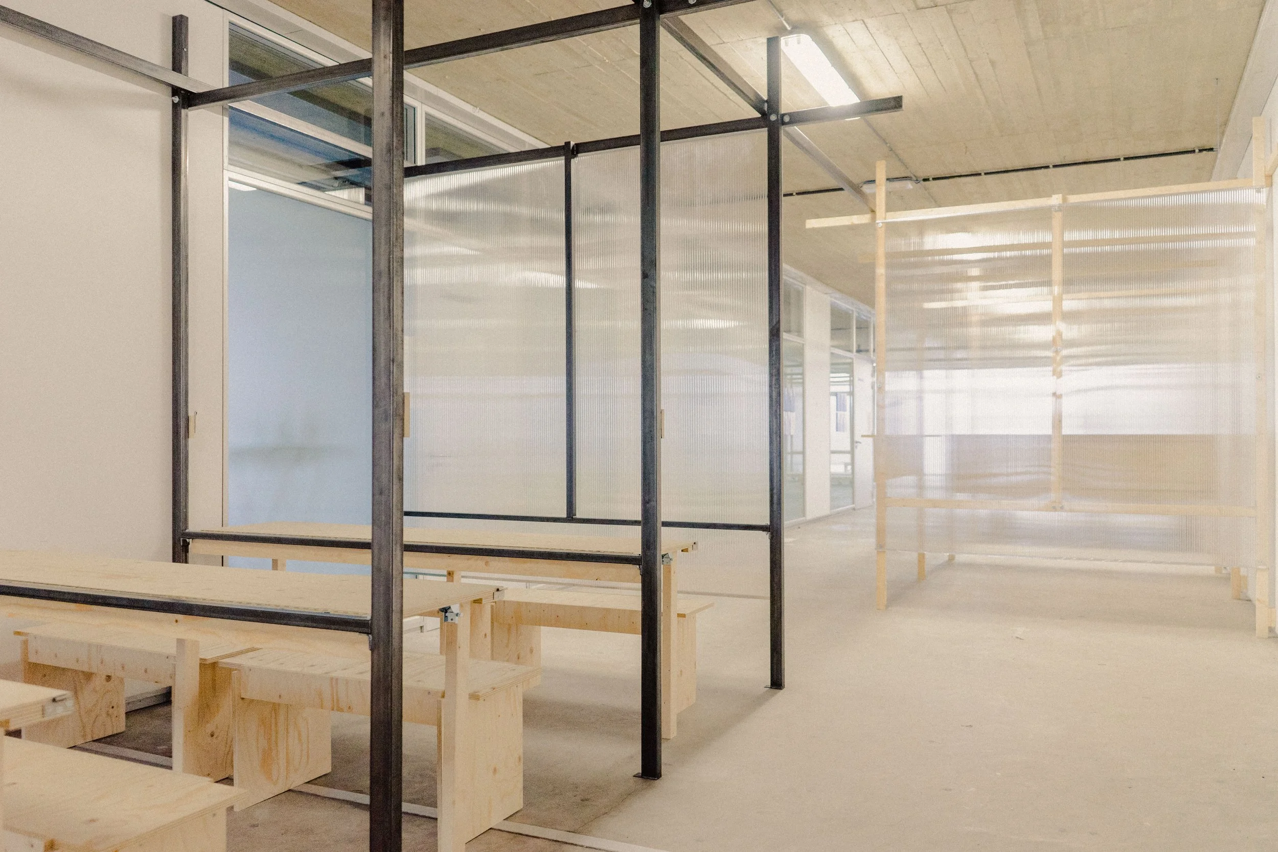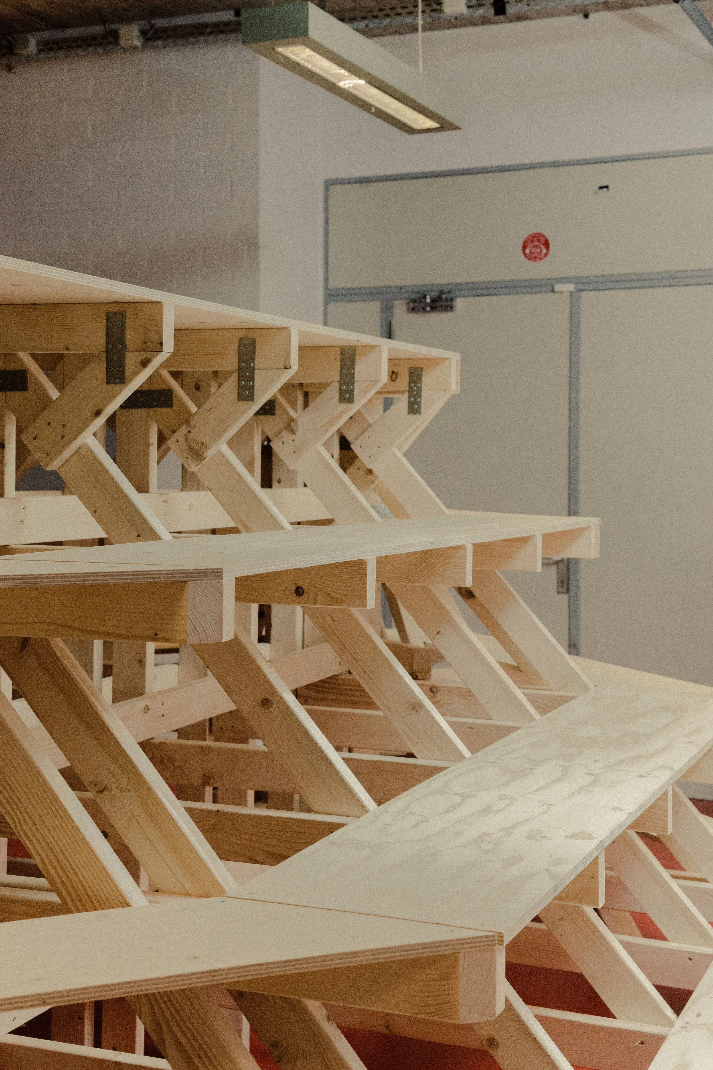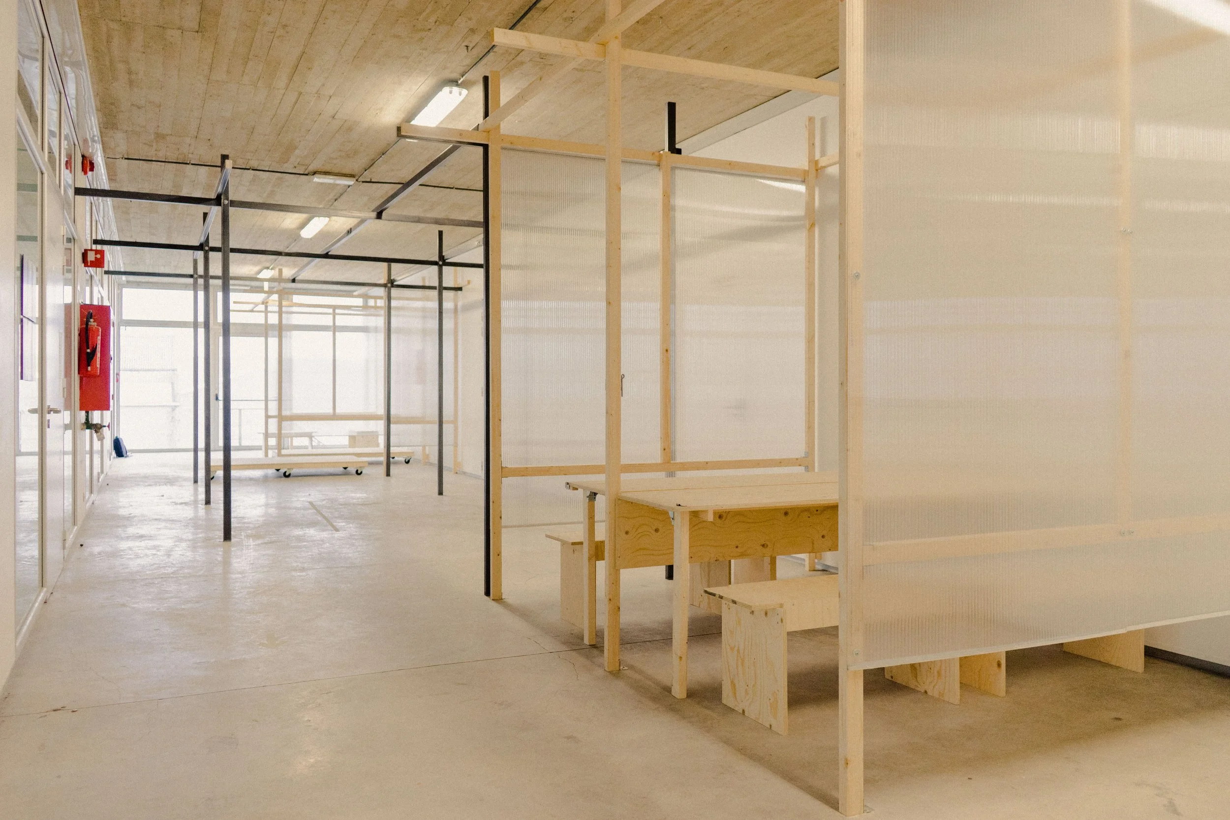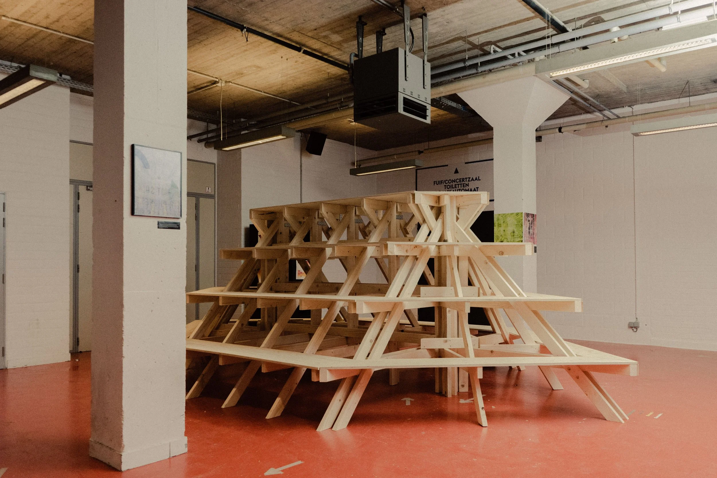 Multifunctionele constructies en ontmoetingsplek gemaakt voor het entrepot in Brugge, ontwerp en uitvoering door STAM Collective (Studio Tim Somers + Atelier Sam Declercq)